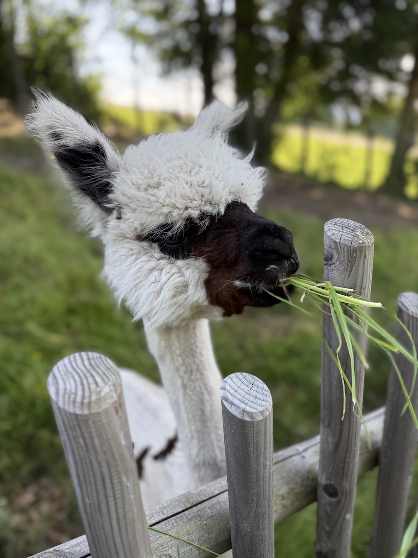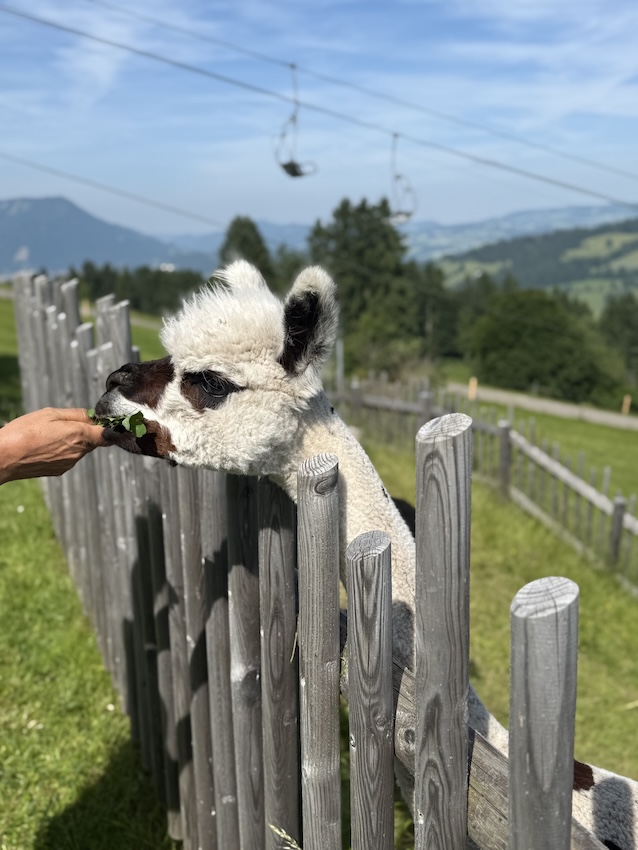 Zum KUKU Berghotel gehören aktuell drei neugierige Alpakas, die sich freuen, wenn du sie mit Gras fütterst, aber bitte nur mit Gras.